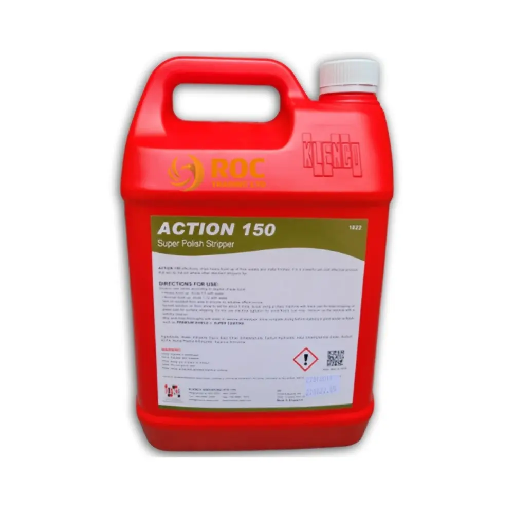Action 150 Klenco có hàm lượng dung môi và chất tẩy hàm lượng cao dùng để tẩy bóc lớp seal (men) trên các bề mặt sàn làm từ vật liệu như: nhựa , sàn vinyl, đá hoa cương, đá cẩm thạch, gạch men, ngoại trừ sàn nhựa đường hay sàn có độ xốp.